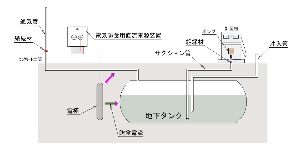 電気防食工事は地下タンクや埋設油配管に直流電流を流すことで腐食の進行を防止する方法です。